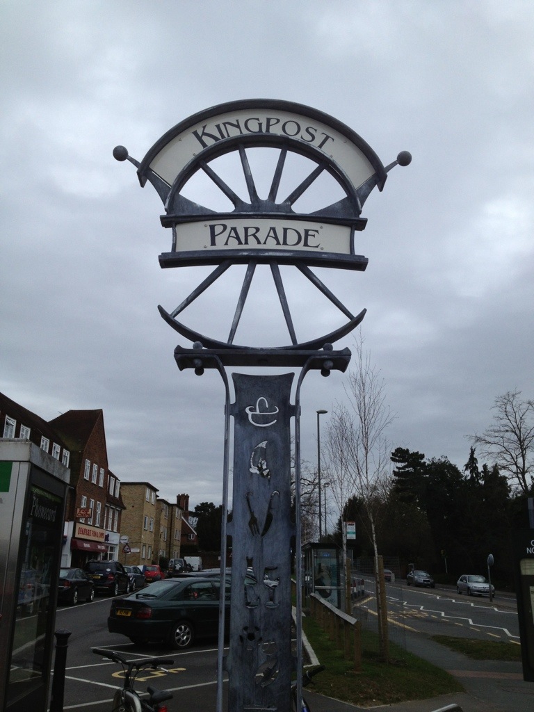 Following a ballot on the design by local residents, a new landmark metal sign has been erected at the parade of shops on London Road. On one side it states ‘Kingpost Parade’ and on the other ‘London Road Parade’, reflecting the different names of the two halves of the shopping parade.
